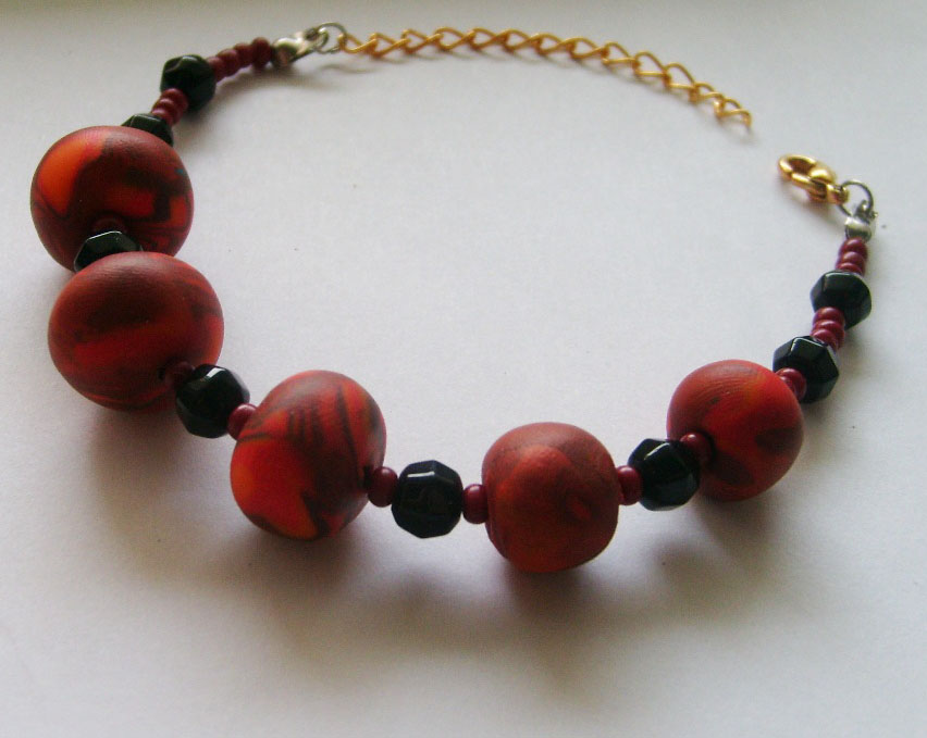 Náramok tvorený ručne z polymérovej hmoty, čiernych a červených korálok, spojené pevným silonom. Zapínanie na karabinku s predlžovacou koncovou retiazkou. Kód 041 Cena 5 €