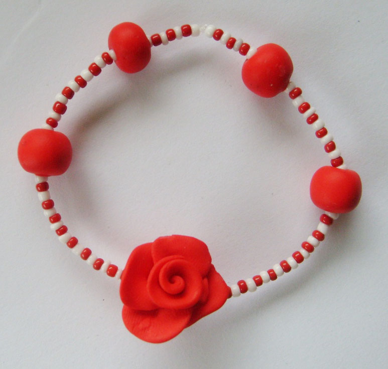 Náramok tvorený ručne z polymérovej hmoty, červených a bielych korálok. Spojené pevnou gumičkou, prispôsobí sa každému zápästiu. Kód 065 Cena 5 €