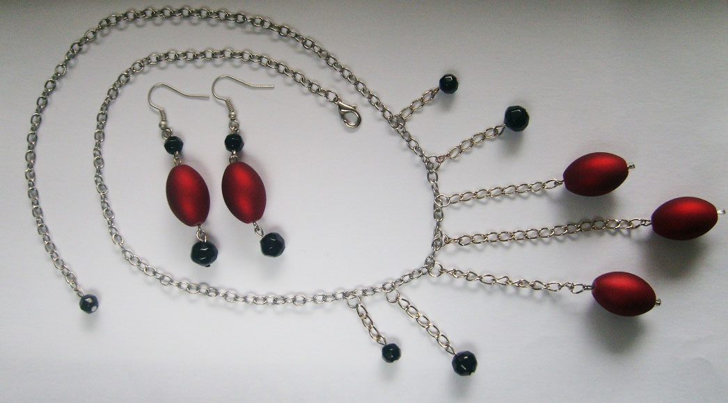 Set tvorí náhrdelník a náušnice, tvorený je ručne z luxusných korálok a kovových komponentov striebornej farby.